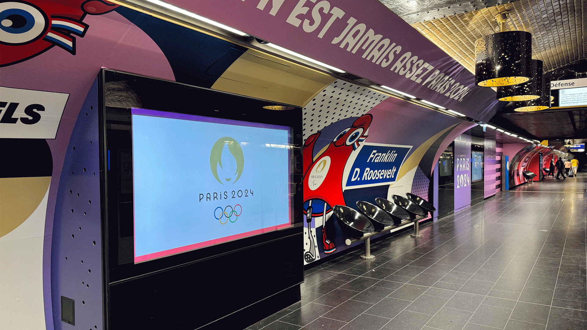 Habillage des quais Franklin Rooslvelt ligne 1 à l’occasion de l’ouverture du megastore Paris 2024